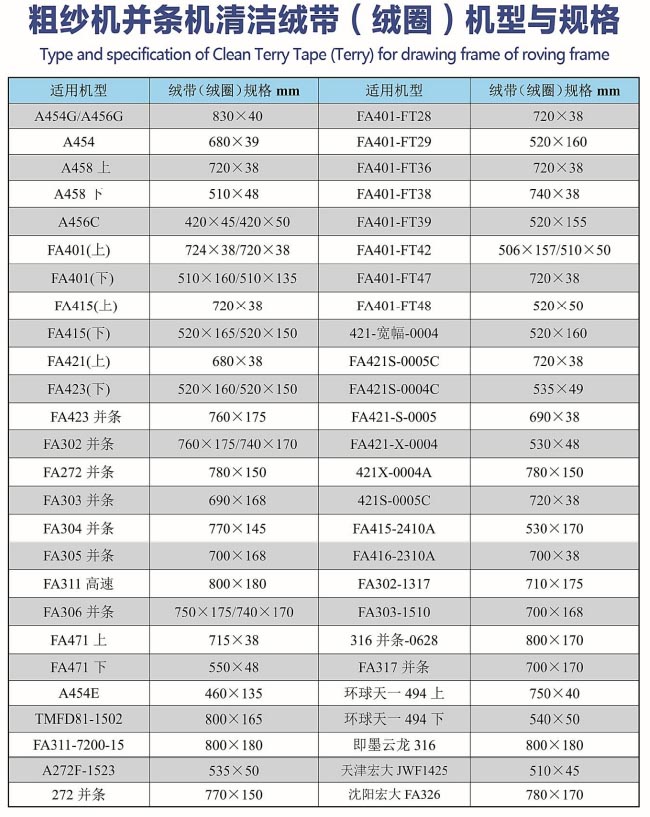 我公司降重推出第九代新型高科技納米材料,粗紗機、并條機清潔絨帶(絨),真正做到了無靜電、抗靜電、無熒光、永不拉長、四條絨帶在清潔器上運轉平穩一致,而且不起棉結、清花效果比羊毛(白呢)和尼龍絨毛植絨帶提高了2倍,清花效果中有利的把附著在膠輥和羅拉上的短絨、飛花、雜質清掉,使粗紗干條大大減少了游羽、圈羽現象,永不拉長節約了停機次數,為粗紗車間每年節省用工17-21個工期,提高了效率,為紡織廠節省了開支。從前的絨帶全部有熒光,第九代絨帶真正做到了無熒光,在現代紡紗中,提倡紗線的綠色健康熒光實際就是化工化學產品而造成的,我們采用意大利進口白棕樹棕毛,經過12道工序制作當前絨化,又開發了先進的植絨機器,讓絨毛和底布結合的更牢固,如果絨帶上有熒光,就造成了絨帶和羅毛,拉摩擦產生靜電、起棉結現象,棉結落到粗紗干上,造成了很大的瑕疵,還有棉紗上有熒光,大大影響了染色有瑕疵、有異纖。新型高科技納米材料絨帶,它降低紗疵、提高成紗質量,從而達到******高立,提高產品******化。